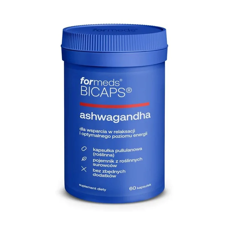BICAPS Ashwagandha, 60 kapsułek Formeds - suplement diety bez dodatku sztucznych wypełniaczy, barwników i konserwantów. Zawiera 29mg witanolidów z korzenia ashwagandhy w 1 kapsułce.