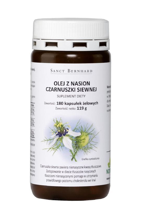 Kapsułki z olejek z nasion czarnuszki siewnej 180 kapsułek NOMAK -Olej powstaje z niewielkich nasion rośliny zwanej czarnuszką siewną (nigella sativa), lub czarnym kminkiem. Pochodzi ona z rejonów Turcji i Iraku, obecnie rośnie dziko również w krajach basenu Morza Śródziemnego.