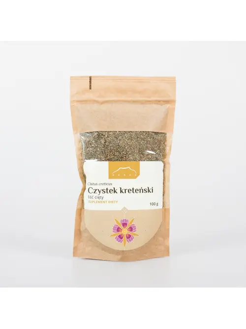 Nanga Czystek kreteński liść cięty 100g Cistus creticus wzmacnia odporność. Wspiera organizm w walce z boreliozą oraz infekcjami bakteryjnymi, wirusowymi i grzybiczymi.