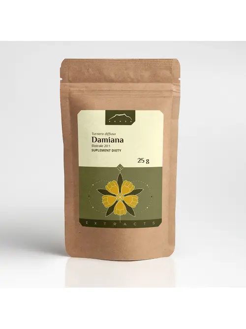 Nanga Damiana ekstrakt 20:1 25g Damiana (Turnera diffusa) to gatunek krzewu z rodziny męczennicowatych (Passifloraceae). Roślina występuje w Meksyku, Ameryce Południowej, na Karaibach i w południowej części Ameryki Północnej. Spotykana jest również w Afryce i Indiach.