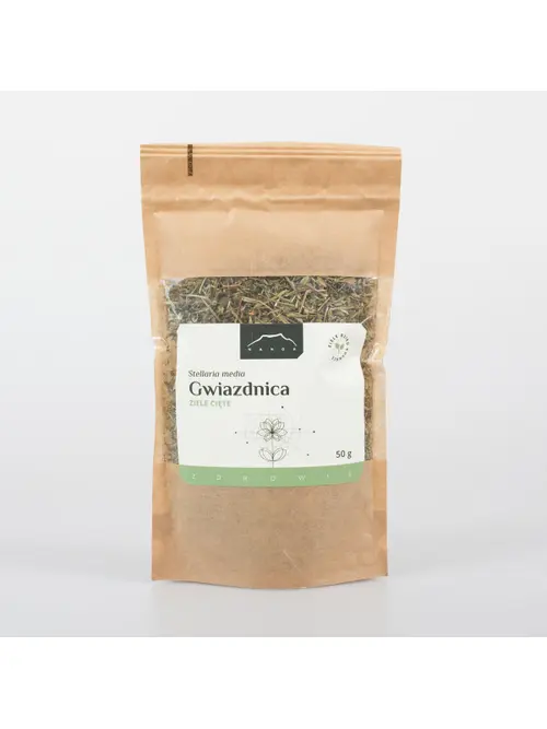Nanga Gwiazdnica Ziele 50g Stellaria media przyspiesza gojenie się ran, wyprysków i trądziku. Łagodzi podrażnienia i zmniejsza stany zapalne skóry. Oczyszcza ją i nawilża.